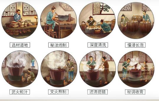 2、八道工艺,古法熬制:历经12小时浸渍,3道提取,4次浓缩,48小时化胶,武火3次熬,文火收成膏,经过选、制、洗、泡、煎、秘、滤、收等8到工序,耗时多日,古法收膏。