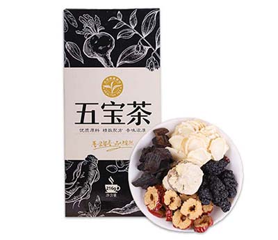 1、五宝茶的泡法:五宝茶它的主要成分就是枸杞子,桂圆,山药,桂肉,杜仲等,直接把这些茶叶放在一起,用温水冲泡,一会清香扑鼻的五宝茶就制作而成了。当然大家也可以直接到正规的药店或是网上商城购买,品质也是有保障的,如就是很好的选择。