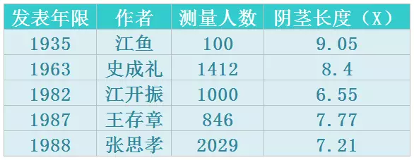 表1是不同学者测量的自然状态下的中国男性平均长度,虽说年代久远,但依然可以作为当今我国成年男性长度的判断基础。表2来自吴伟德教授的长度的测量方法及误差研究,它显示出自然状态下中国成年男性的长度平均值是8.20cm,Duang起之后的状态下平均长度是13.65cm。