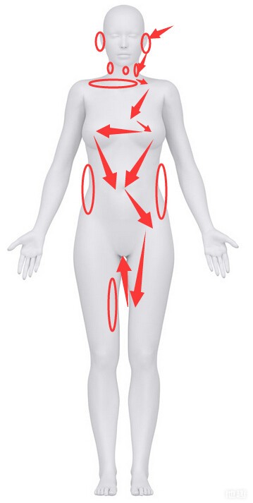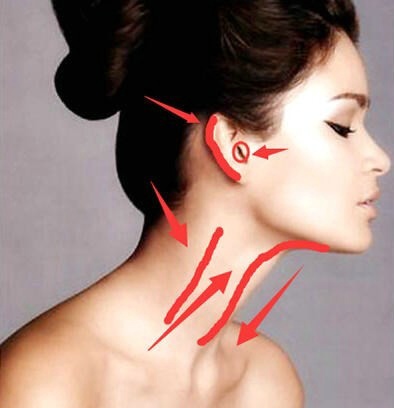 脖子可以从左往右,舔冰淇淋的那种方法可以用在这里。此处用舌尖,重点刺激,按箭头方向。可以尝试用舌尖或者整个舌头覆盖从下往上刺激,观察对方对于那种比较有感觉。