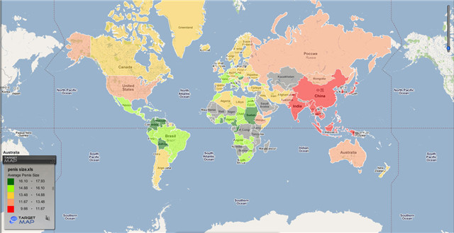 谷歌targetmap曾经公布过一张世界各国丁丁尺寸排名的地图,这张DD长度地图中将不同国家男性勃起后的尺寸分为五档: