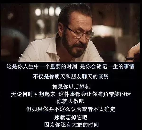 父亲的回答是:“不要因为他不高兴而去他家,这不该是唯一的理由。 而且你别指望我能多支持你去 。但我要说的是, 这是你人生中一个重要的时刻 是你会铭记一生的事 ,不仅是你明天和朋友聊天的谈资, 如果你以后想起, 无论何时回想起来 这件事会让你嘴角带笑的话, 你就去做吧 。但如果你并不这么认为或者不太确定 ,那就忘掉他吧, 因为你还有大把的时间。”