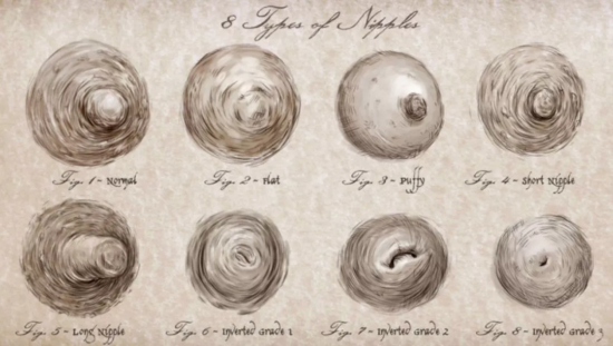 从图片的手绘风格就明白了,这么多年过去也没什么新的形状产生,基本分类就两种:凸起和凹陷。当然也有大小和位置的差别,但是整体上来讲,这都是由基因决定的,也就是说女性的乳头形状大概率跟自己的直系女性亲属的类似。