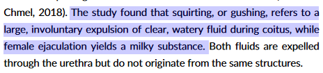 【研究发现,喷射,或喷涌,是指在性交过程中,大量的、不自觉的排出透明的、水状液体,而女性射精(射液)会产生乳白色物质。两种液体都通过尿道排出,但并非源自相同的结构。】