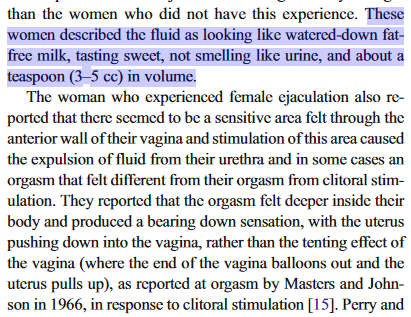 但真实的潮吹可能是这样的:【这些女性描述说,这种液体看起来像是稀释的无脂牛奶,味道甜美,不像尿液的味道,体积大约为3-5毫升。】